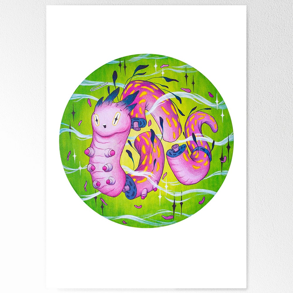 Momentary Bliss is a fine art print of an original surreal illustration, celebrating brief yet intense moments of happiness. The artwork features a whimsical, dreamlike creature in vivid pinks against a luminous green background, evoking energy and playful wonder.